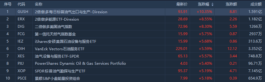 2倍做多每日标普油气出口与生产的GUSH涨10.35%,成交额1.59亿美元;2倍做多能源ETF涨8.55%,成交额1.18亿美元。