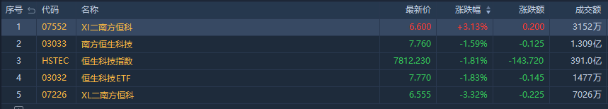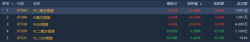 跌幅居前的有南方两倍看多恒指(07200.HK)跌1.28%,成交额1.17亿港元。