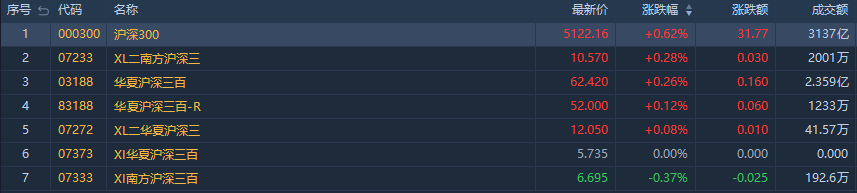 沪深300指数收涨0.62%。其中,华夏沪深三百-R(83188.HK)涨0.12%,成交额1233万港元;华夏沪深三百ETF(03188.HK)涨0.26%,成交额2.36亿港元。