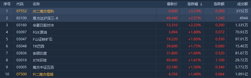 今日涨幅居前的ETF有南方两倍做空恒科ETF涨3.13%,成交额3152万港元;易方达沪深三-R涨2.57%;南方两倍看空恒指ETF涨1.49%,成交额1.99亿港元;