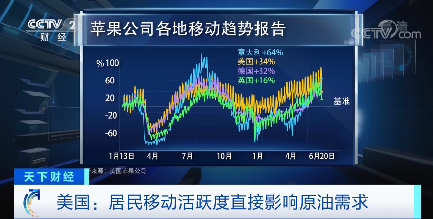 美国能源信息署的统计显示,在美国有高达66%的原油用于交通,因此,居民移动的活跃度是体现原油需求的一个非常直观的指标,而自多地不断重启经济以来,这一指标正在稳定回升。苹果公司统计自去年1月13日以来的各国民众移动指数显示,到今年6月20日,美国指数上涨了34%,这种趋势同样体现在欧洲,同一时间段内,主要国家中,意大利指数上涨64%,德国上涨32%,英国上涨16%。