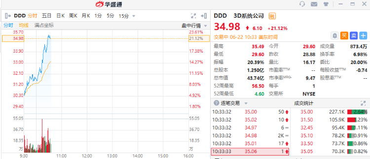 美股异动 | 3D系统涨幅扩大至22%,公司和以色列再生医学公司合作