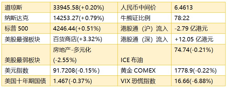 1、隔夜美股道琼斯指数涨68.61点,涨幅0.2%,报33945.58点;纳斯达克综合指数涨111.79点,涨幅0.79%,报14253.27点;标普500指数涨21.65点,涨幅0.51%,报4246.44点。港股ADR指数上涨,按比例计算,收报28425点,涨115.78点或0.41%。