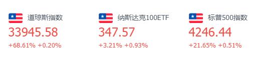截至收盘,道琼斯指数涨68.61点,涨幅0.2%,报33945.58点;纳斯达克综合指数涨111.79点,涨幅0.79%,报14253.27点;标普500指数涨21.65点,涨幅0.51%,报4246.44点。