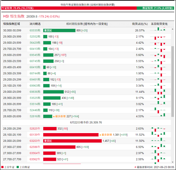 街货分布方面,至周二,恒指牛证街货贴价区间主要在收回价27900点至28300点之间,累计相当约3975张期指合约;恒指熊证街货在收回价29600点至30100点,累计相当约1464张期指合约。