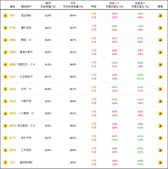周二恒指相关权证的平均引伸波幅报约20.4%。个股方面,港交所、京东相关认购证的引伸波幅按日小幅调升;相反,道琼斯指数、比亚迪股份相关认沽证的引伸波幅则按日小幅调降。