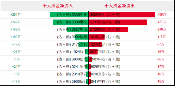 淡仓(认沽证及熊证)方面,周二中石油、港交所相关淡仓单日分别录得约281万、262万港元资金净流入,美团、比亚迪股份相关淡仓单日分别录得约489万、427万港元资金净流出。
