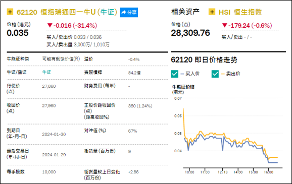 2、看错方向:恒指瑞通四—牛U(62120.HK),周一下跌31.37%。