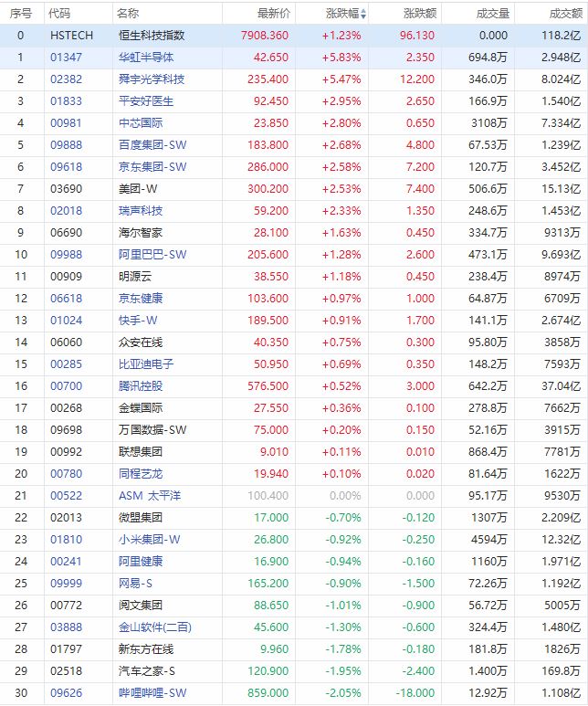 华虹半导体、舜宇光学科技涨超5%;平安好医生、中芯国际、百度集团-SW、京东集团-SW、美团-W、瑞声科技涨超2%。