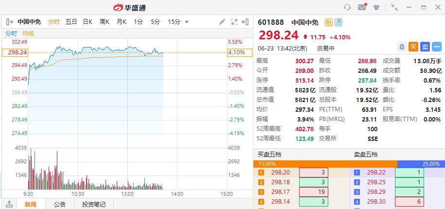 华盛资讯6月23日消息,路透旗下IFR引述消息称,中国旅游集团中国中免计划最快本周提交赴港上市申请。中国中免今日大涨,截止发稿,该股上涨4.1%,现报每股298.24元,总市值5821亿元,成交额38.9亿元。