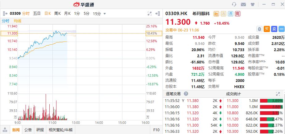 华盛资讯6月23日消息,希玛眼科早盘走高,截止发稿,希玛眼科上涨18.45%,现报每股11.3港元,总市值129.8亿港元,成交额2.812亿港元,换手率2.28%,值得关注的是,该股连续二十天累计涨幅89.95%。
