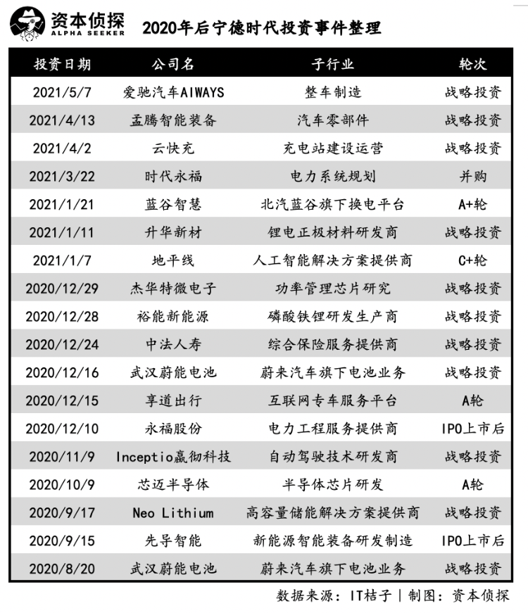 有钱了的宁德时代也开始往产业链上下游撒钱,去年8月11日,宁德时代发布公告称,将对境内外产业链上下游优质上市企业进行投资,投资总额将不超过190.67亿元,其中境外投资总额不超过25亿美元。根据IT桔子数据,宁德时代从2020年开始投资节奏明显加快,一年完成了共11笔对外投资,这一节奏在今年得以保持,半年内已完成七笔对外投资。