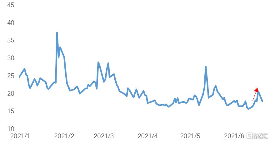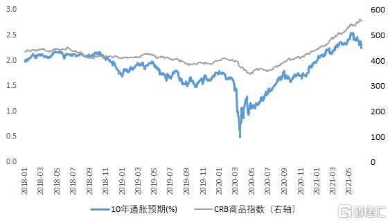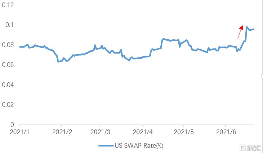 短端方面,加息预期提前,中短期(2-5年)美债利率上行。点阵图显示,首次加息的时间被提前,到2023年底,美联储将加息两次(50个基点)。其中,7名委员(今年3月为4名委员)预计在2022年开始加息,13名委员(今年3月为7名委员)预计在2023年开始加息。