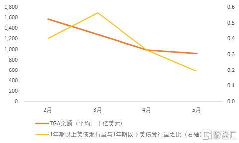 长端方面,商品价格下跌主导通胀预期回落,10年盈亏平衡利率显示的通胀预期自5月高位回落至2.24%,同时Risk off情绪下资金避险逐利美债。另一方面,近期美债发行期限结构相对有利于长端,同时TGA账户持续释放流动性,长端美债供小于求,流动性主导长端美债利率(以及TIPS流动性溢价)回落。