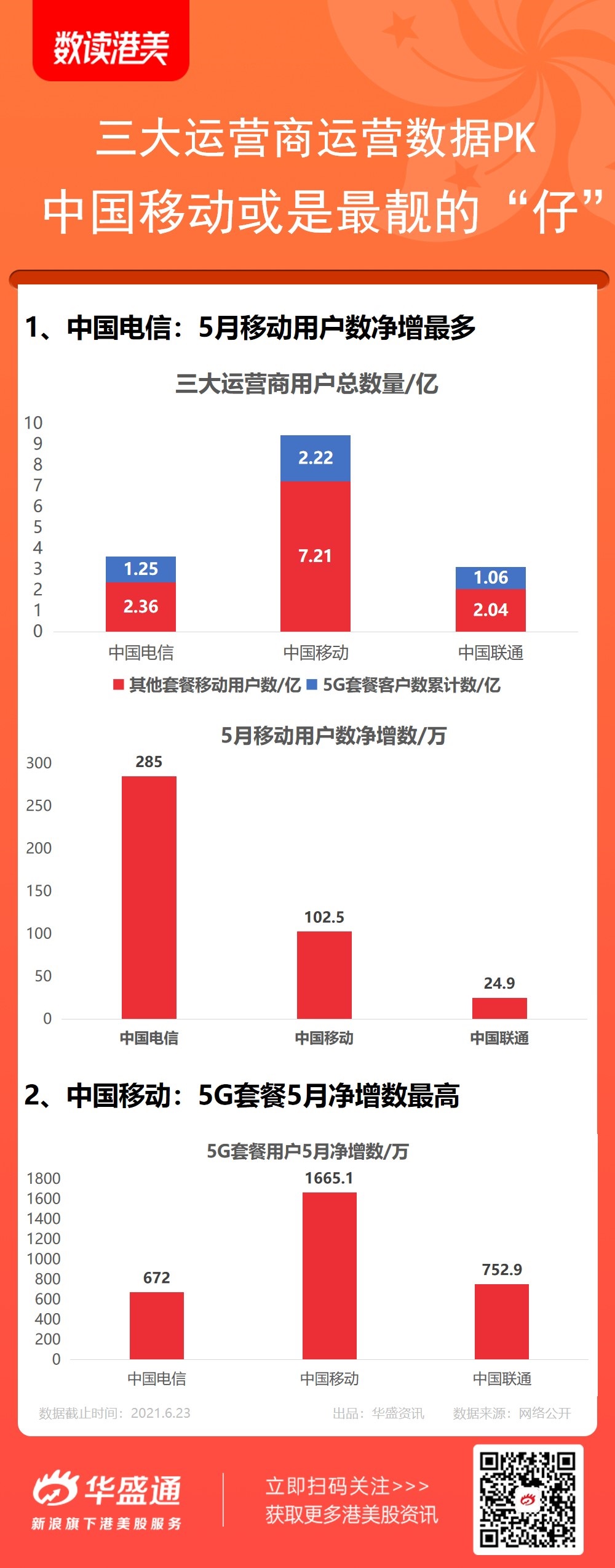 6月22日,三大运营商先后公布2021年5月份运营数据。