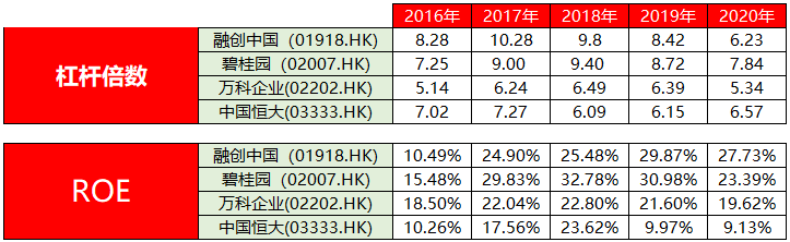 由以上数据可以看到,融创在2020年ROE表现最好,且近4年来表现较为稳定。随后则是碧桂园,前三年的表现甚至好于融创。而万科和恒大则走了明显的下坡路,尤其是恒大。