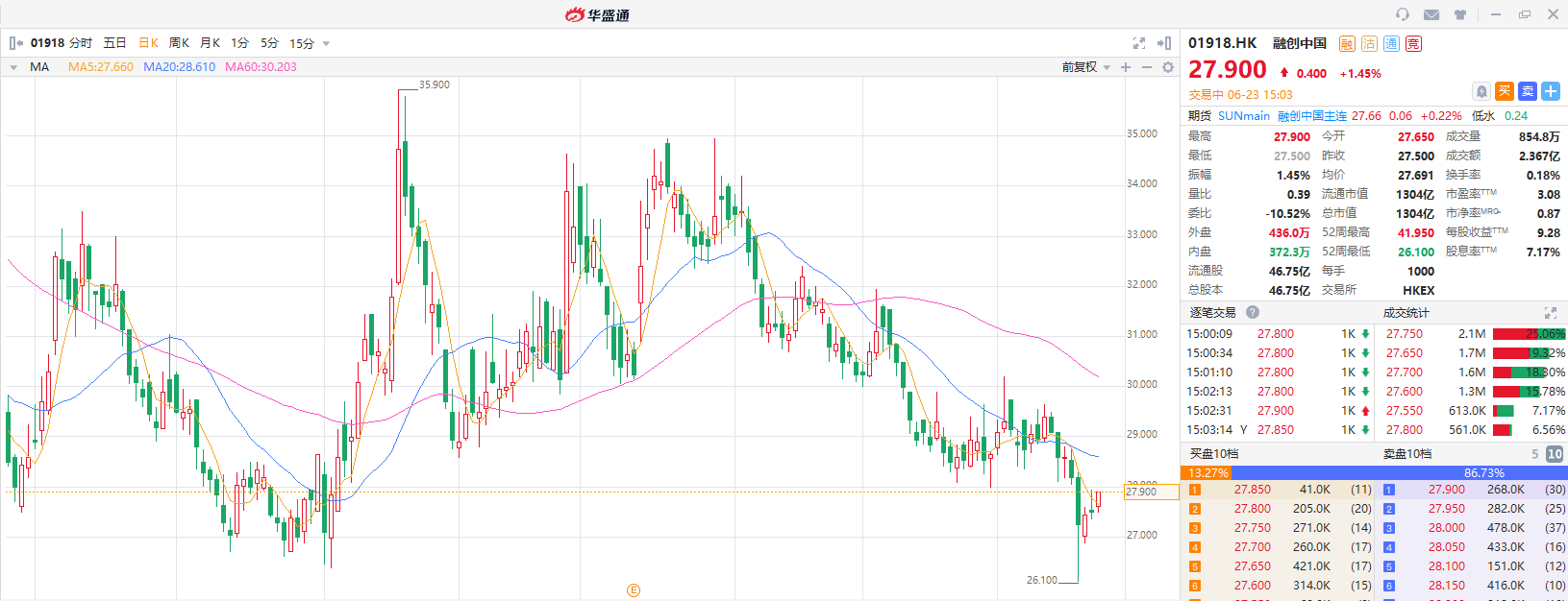 据港交所数据,融创中国总裁孙宏斌近半年来4次增持了自家股票,总耗资已经达到2.3亿港元。不仅如此,高管汪孟德也进行了增持,纷纷看好自己股票表现。鉴于融创仅3倍PE,0.8倍PB的表现,机构认为“极度低估”,纷纷看好融创股价。中泰国际给出46.9港元的目标价,第一上海看涨至42.2港元,东北证券则认为公司股价可升至47.4港元。截至发稿,融创中国微涨1.45%报27.9港元,暗示上涨空间广阔。