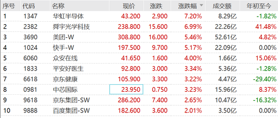 今天,涨势最为犀利的自然是超跌的恒生科技指数成份。其中,华虹半导体涨超7%,舜宇光学涨近7%,美团、快手等涨超5%,京东、百度、腾讯等集体反弹。