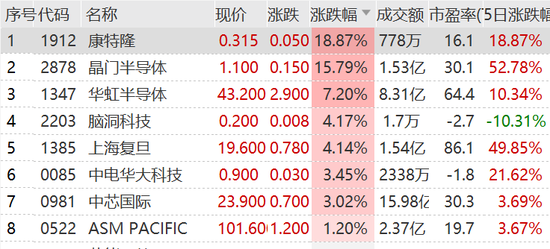 随着芯片荒加剧,芯片概念股近期强势,晶门半导体5日涨超50%,上海复旦也涨近50%。