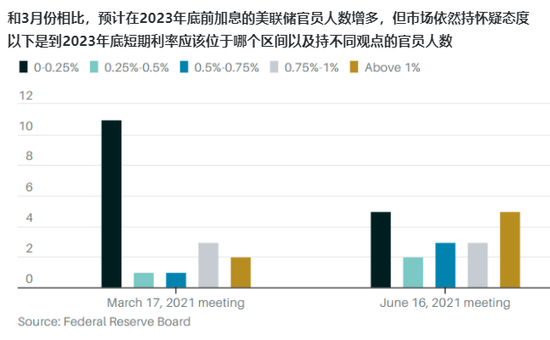 鲍威尔和之前几届美联储主席一样,建议投资者把美联储官员的预期(即点阵图)作为参考就好,但从某种程度上来说,点阵图有助于投资者了解美联储内部正在进行的讨论。从点阵图来看,预测2022年加息的官员数量比3月份会议只增加了三位,不足以把预测中值从0.125%提高至更高水平。总之,即便最持怀疑态度的成员正在考虑在2023年将利率提高0.5%,那这一切究竟又能有多强硬呢?