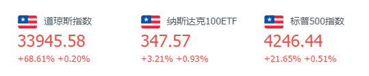 周二(6月22日),截至收盘,道琼斯指数涨68.61点,涨幅0.2%,报33945.58点;纳斯达克综合指数涨111.79点,涨幅0.79%,报14253.27点;标普500指数涨21.65点,涨幅0.51%,报4246.44点。