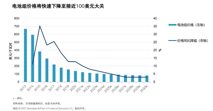 标普全球评级预计锂电池组的价格最早可在2024年降至每千瓦时100美元。业内人士表示,这一水平将成为电动汽车大规模普及的拐点。这将使电动汽车与等效内燃机汽车一样便宜。