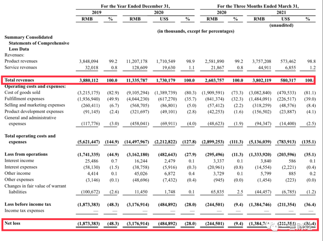 2021年第一季度,商品销售支出占总收入81.1%,履约费用占总收入39.0%;2020年第一季度同期,两项指标分别占总收入73.3%和32.3%。