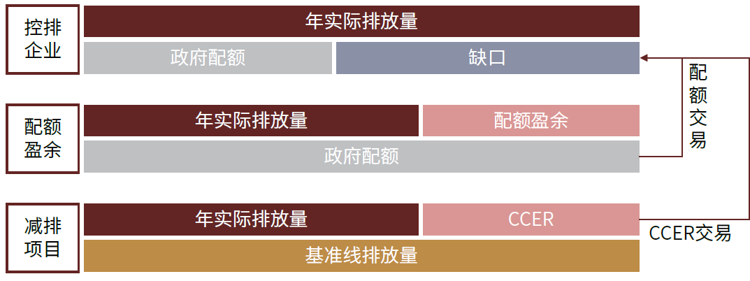 碳市场建设的本质是为体现减排的合理生态价值。目前全国碳交易市场由配额市场(强制市场)和CCER市场(自愿市场)组成。配额市场的控排企业由生态环境主管部门分配排放额度,企业可以按照自身的盈余和缺口交易;CCER市场可以通过抵消机制和配额市场产生联动,重点排放单位可使用CCER或其他减排指标,抵消不超过5%的实际排放量。