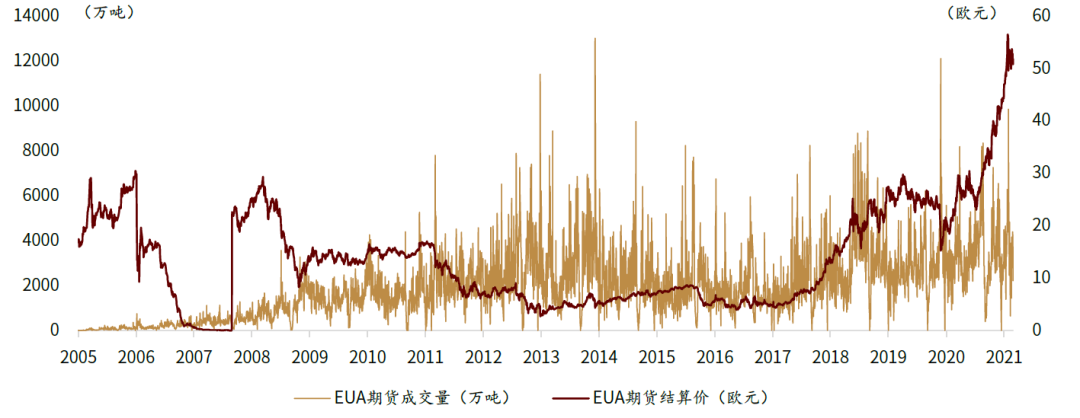 图表:2005年以来欧洲碳市场价格走势(EUA期货合约)