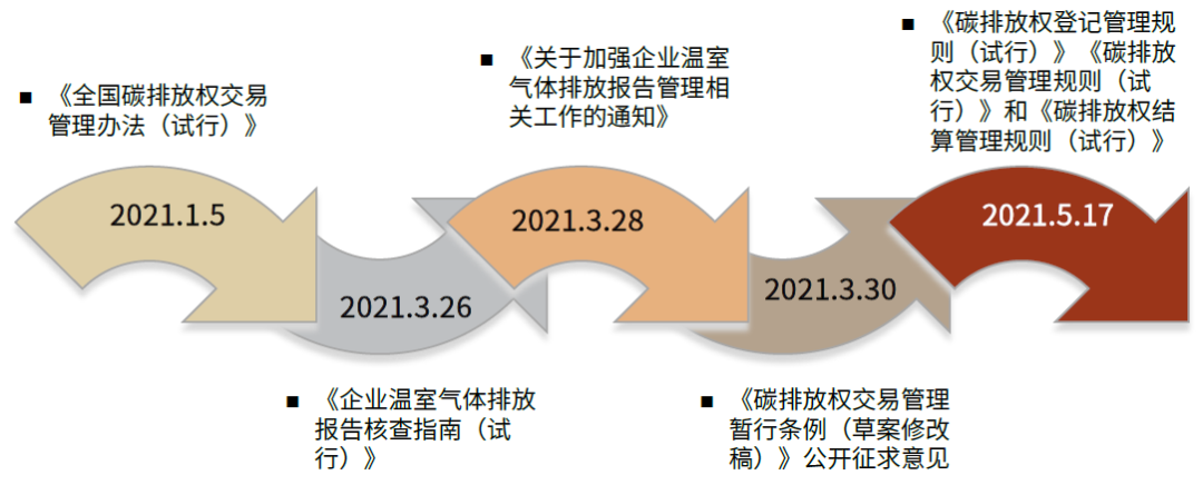 ►2011年就开展碳交易试点:2011年10月国家发展改革委办公厅发布《关于开展碳排放权交易试点工作的通知》,正式批准北京、上海、天津、重庆、湖北、广东和深圳等七省市开展碳交易试点工作,我国碳市场建设在探索中不断发展,正逐步从区域性碳市场向全国性碳市场发展。