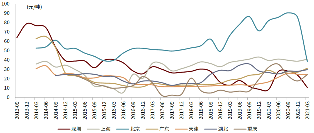 固废资源化有望受益CCER加速发展。根据RMI测算,钢铁、水泥、铝和塑料行业到2050年有高达230亿吨的碳减排潜力,而资源化是其中重要的一环,也是助力碳中和目标实现的重要手段之一。据相关研究[2],废纸/废铜/塑料的回收温室气体减排效率分别达5.42/14/0.36 tCO2e/t,按CCER价格30元/吨测算,吨处理增量收益分别为162.6/420/10.8元。我们认为固废资源化有望受益CCER,未来逐步释放碳减排潜力的同时获取碳交易市场增量收益。