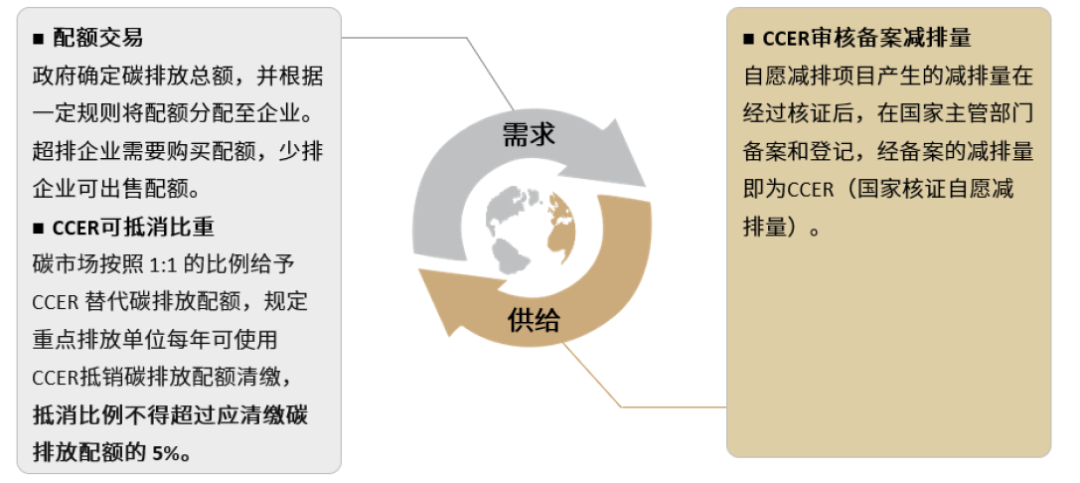 配额市场和CCER市场通过抵消机制联动。碳排放配额总量和分配方案由生态环境部根据国家温室气体排放要求,综合考虑各方面因素制定。省级生态环境主管部门则根据配额总量和分配方案向区域内重点排放单位分配规定年度的碳排放配额。对于排放企业而言,配额和实际排放之间的缺口和盈余可以进行交易,当前我国对重点单位实行配额免费发放。根据《碳排放权交易管理办法(试行)》的规定,配额市场(强制交易市场)和CCER市场(自愿交易市场)能够通过抵消机制产生联动。具体来说,重点排放单位可使用国家核证自愿减排量(CCER)或生态环境部另行公布的其他减排指标,抵消其不超过5%的经核查排放量。1单位CCER可抵消1吨二氧化碳当量的排放量。