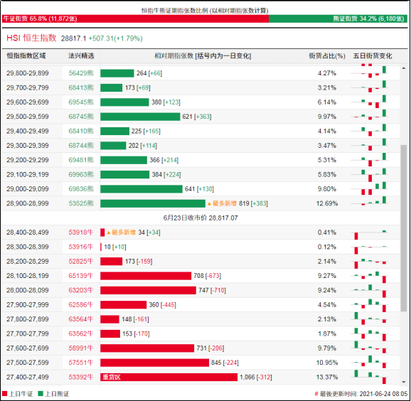 街货分布方面,至周三,恒指牛证街货贴价区间主要在收回价27400点至28000点之间,累计相当约2795张期指合约;恒指熊证街货在收回价28900点至29400点,累计相当约2412张期指合约。