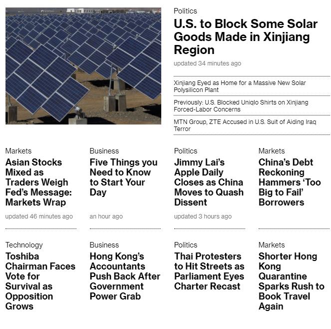 据几位知情人士透露,美国准备禁止新疆地区制造的一些太阳能产品。新疆的工厂 生产了全球大约一半的多晶硅供应量,这是一种对太阳能电池板至关重要的材料和半导体。