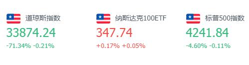 截至收盘,纳斯达克综合指数涨18.46点,涨幅0.13%,报14271.73点,创收盘历史新高;道琼斯指数跌71.34点,跌幅0.21%,报33874.24点;标普500指数跌4.6点,跌幅0.11%,报4241.84点。