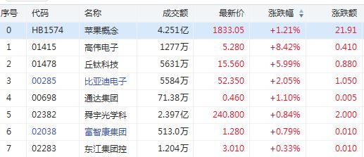 华盛资讯6月24日消息,港股苹果概念股造好,高伟电子涨超8%,丘钛科技涨超5%,比亚迪电子涨超2%。