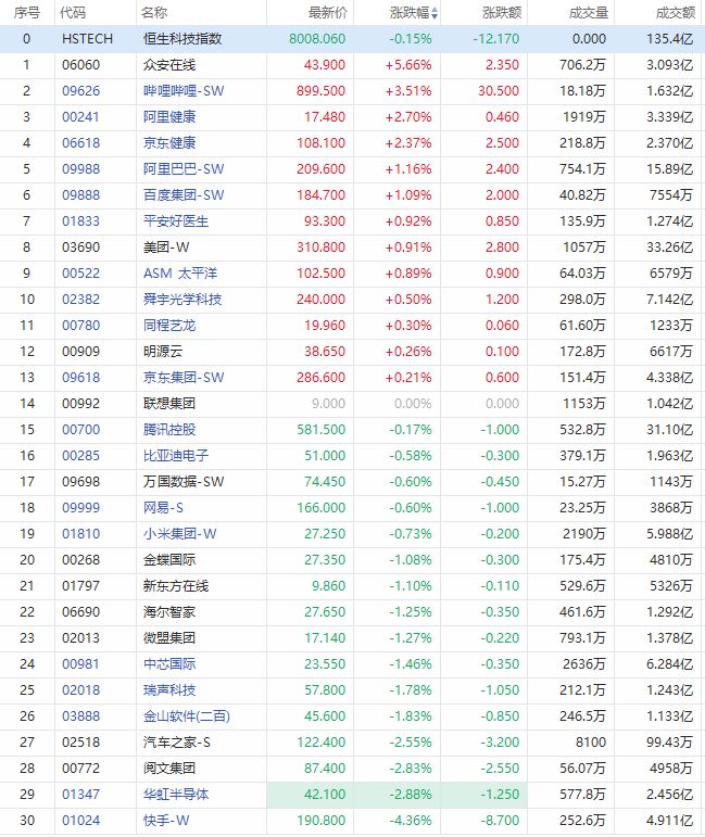 众安在线涨5.66%;哔哩哔哩-SW涨3.51%;阿里健康、京东健康涨超2%;阿里巴巴-SW、百度集团-SW涨超1%。