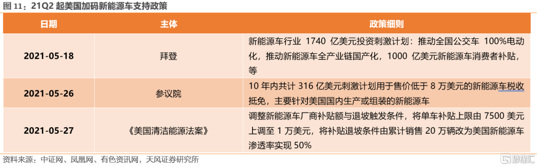 ② 海外侧,欧洲乘用车领域碳中和相关限制陆续落地,渗透率边际递增;美国为追赶行业第一梯队位置,近月来政策大力向新能源车行业倾斜,成长空间广阔。