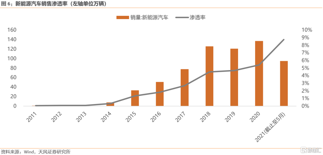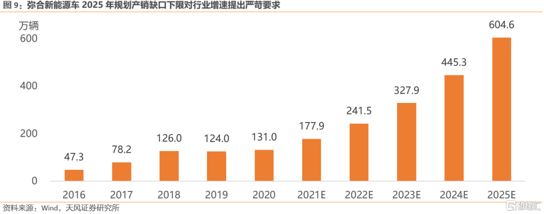 国内方面,碳中和远景规划下,新能源车产销缺口较大。根据国务院《新能源汽车产业发展规划(2021—2035年)》制定的发展愿景,2025年新车销量中新能源车渗透率将超过20%。而中汽协预测2025年汽车新车销量将达3000万辆,据此基于2020年数据推算,新能源车产销边际距实现目标存在至少470万辆的缺口,接近2020年产量的4倍,预计未来5年年均复合增速超过35.8%。