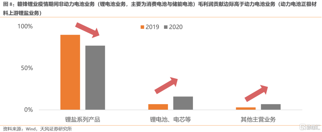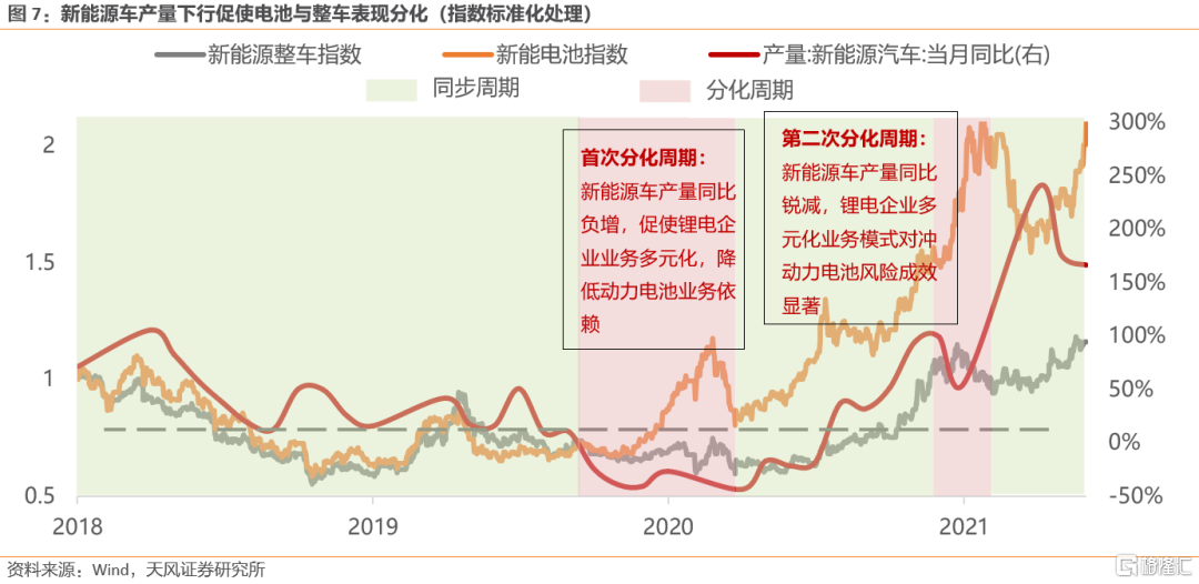以2017年12月31日为基期,将新能源整车指数与新能电池指数标准化后发现:在19Q4新能源汽车产量同比正增周期中,电池与整车表现基本一致;19Q4至20Q1期间,新能源汽车补贴退坡叠加疫情停工,新能源汽车产量同比负增下行,同期电池与整车表现首度分化,订单减少促使锂电企业拓展动力电池以外的业务领域。也正因业务多元化,动力电池业务占营收比重下降,2020年末新能源车产量边际短暂走低期间,电池表现再度优于整车。以新能电池指数第五大权重成分股赣锋锂业为例,2019年公司锂盐产品(正极材料上游原料)收入占毛利润比重约90%,锂电池业务占比约7%,2020年两者占比分别为77%(-13pct)、16%(+9pct),一方面20Q1下游车企订单减少令正极材料需求与价格承压,锂盐价格下行打压了电芯材料相关收入,另一方面公司以TWS耳机电池为首的非动力电池业务产能与销量双扩张,熨平了公司动力电池相关业务带来的营收波动。