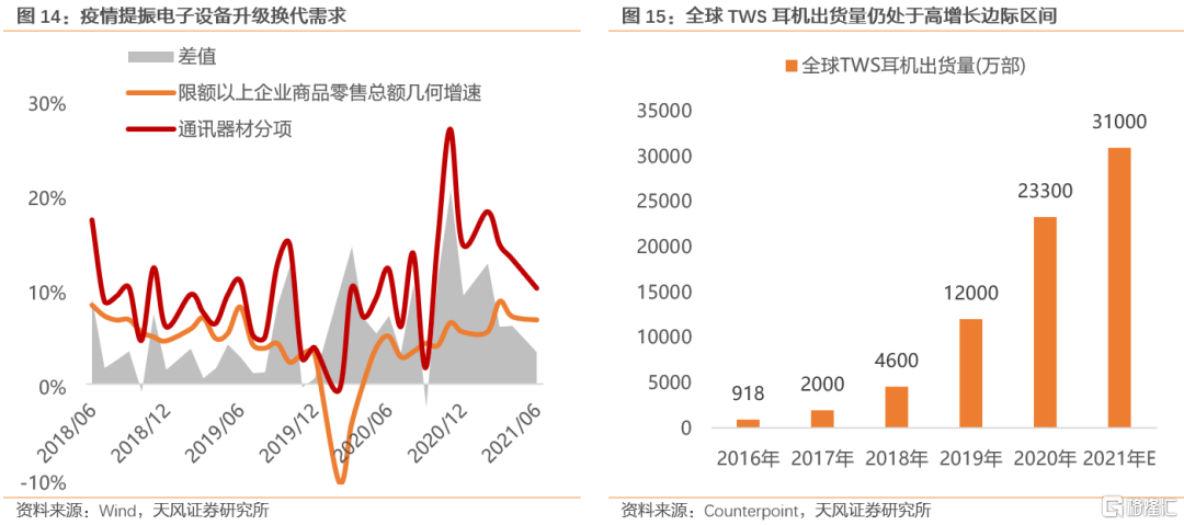 (2)后疫情时代消费电子升级需求维持高势能,消费电池需求处于高位。疫情以来在线教育、远程办公等需求常态化对电子设备升级换代提供了底部支撑,剔除基数效应后,通讯器材作为最直接受益于上述需求的消费电子分支,自疫情起保持高韧性与高边际,进而提振了消费电池需求。仍以赣锋锂业为例,TWS耳机属于消费电子领域消费升级的代表产品之一,公司TWS电池生产基地投产后,2020年产量约5000万副,全球市占率逾20%,令公司锂电池业务收入占比大幅多增128.6%。而对于TWS耳机全球产量来看,仍处于扩张周期,2021年预计全年将实现33%的增长,公司作为TWS电池龙头有望持续受益。