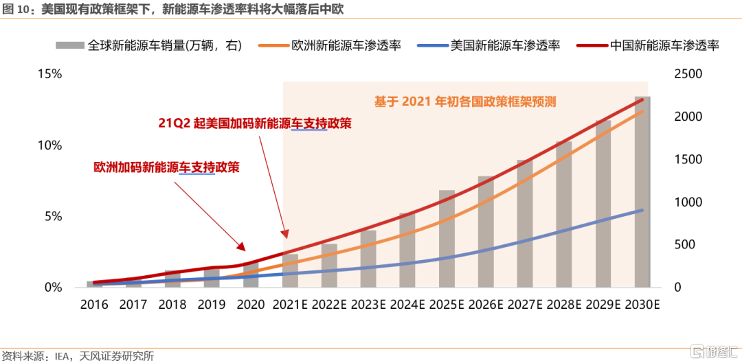 2)海外侧,欧洲乘用车领域碳中和相关限制陆续落地,渗透率边际递增;美国为追赶行业第一梯队位置,近月来政策大力向新能源车行业倾斜,成长空间广阔。