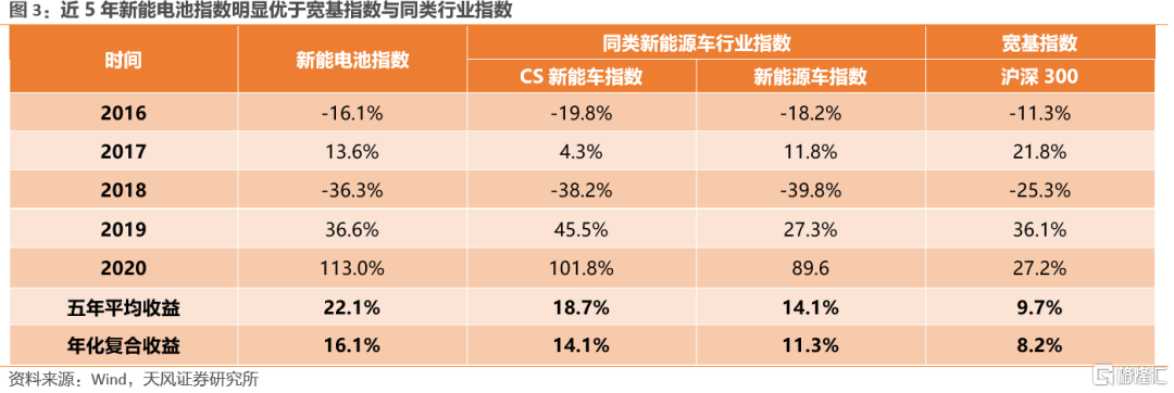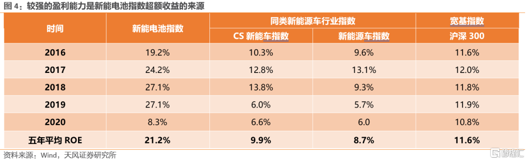 2. 回溯历史,近五年新能电池指数收益显著高于宽基指数与同类新能源车行业指数。持续稳定的超额收益来源于新能电池指数较强的盈利能力,近五年新能电池指数平均ROE水平为21.2%,远高于宽基指数与同类行业指数。