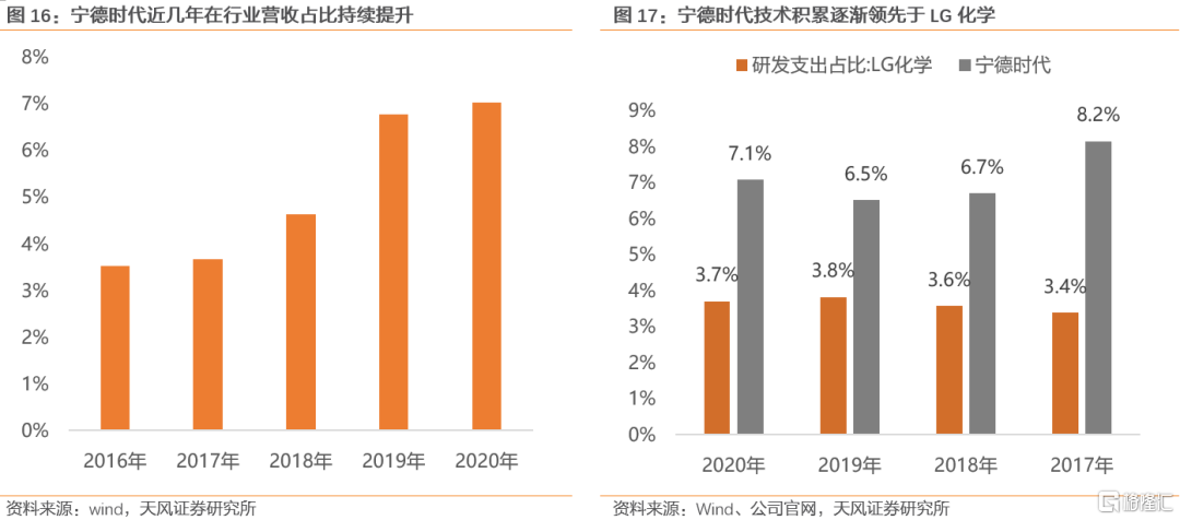 3)锂电产龙头市占率持续提升,而且研发投入优势显著,尽享行业扩张周期红利。从营收占比来看,2016年以来,宁德时代营收在锂电行业中的比重持续提升,从3%上升至7%附近,龙头企业将持续显著受益于新能源车扩张。此外,横向比较,相比于国际龙头,国内龙头技术研发优势也较为显著,这也有利于其持续保持市场份额优势。