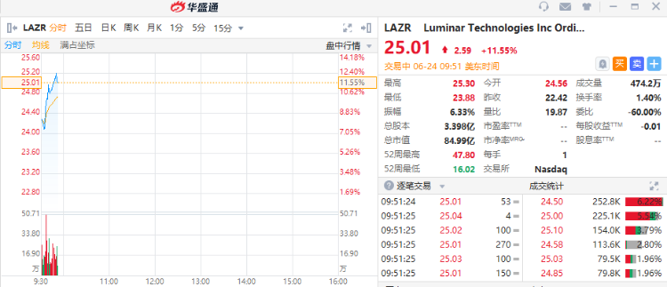 6月24日美股盘初,截至发稿,Luminar(LAZR)涨超11%,其激光雷达技术将成为沃尔沃即将推出的全电动旗舰车的标准配备。