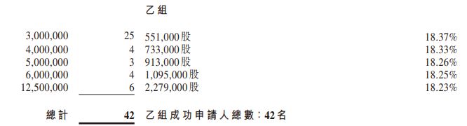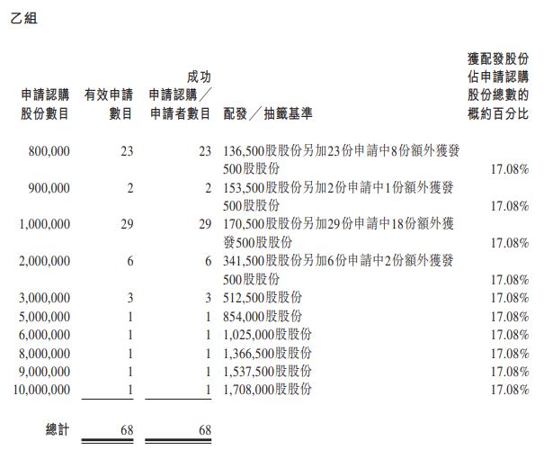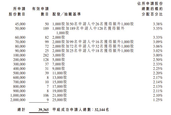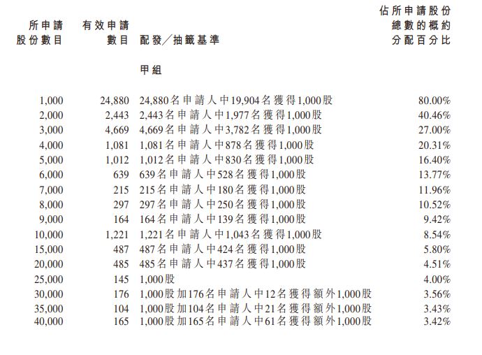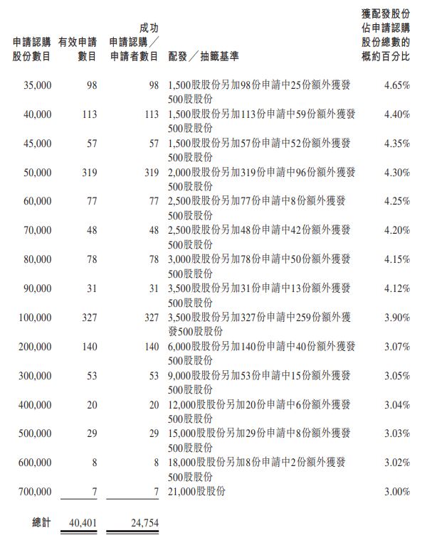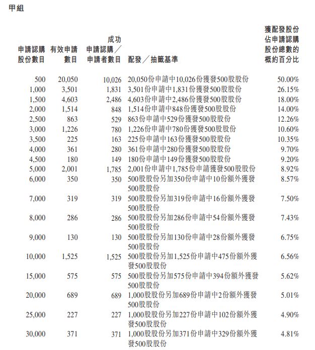 据香港公开发售合共接获40,469份有效申请(包括以白色及黄色申请表格 以及透过中央结算系统向香港结算发出电子认购指示及通过白表eIPO服务提出的申请),涉及合共365,066,500股香港发售股份,相当于根据香港公开发售初步可供认购的香港发售股份总数36,966,000股约9.88倍。