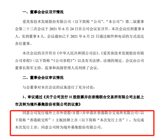 A股医美龙头爱美客6月24日晚间公告,公司董事会当日审议通过议案,同意公司发行境外上市外资股(H股)并申请在香港联合交易所有限公司主板挂牌上市;为完成本次发行上市,同意公司转为境外募集股份有限公司。