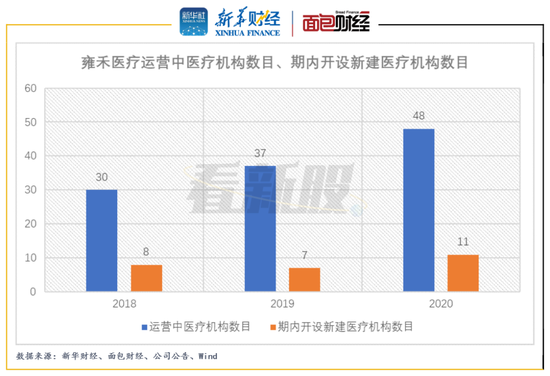 雍禾医疗营收增长受益于旗下医疗机构的扩张以及同店销售额的增长。数据显示,公司运营中医疗机构数目由2018年底30家上升至2020年底48家。公司2020年开设新建医疗机构11家,相比2018年和2019年有所加快。