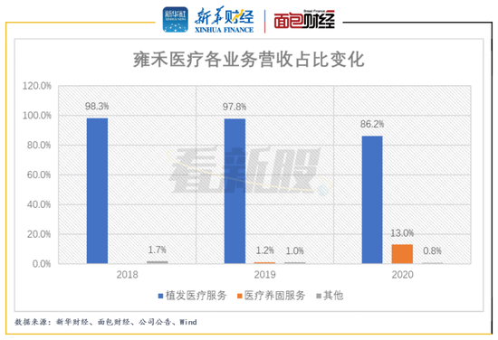 从营收构成来看,雍禾医疗2020年来自于植发医疗服务、医疗养固服务、其他业务的营收分别为14.13亿元、2.13亿元和0.12亿元,营收占比分别为86.2%、13.0%和0.8%。
