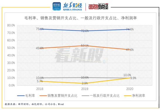 公司近三年的毛利率均在70%以上,但受较高的销售费用率等因素拖累,公司的净利率并不算高。